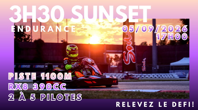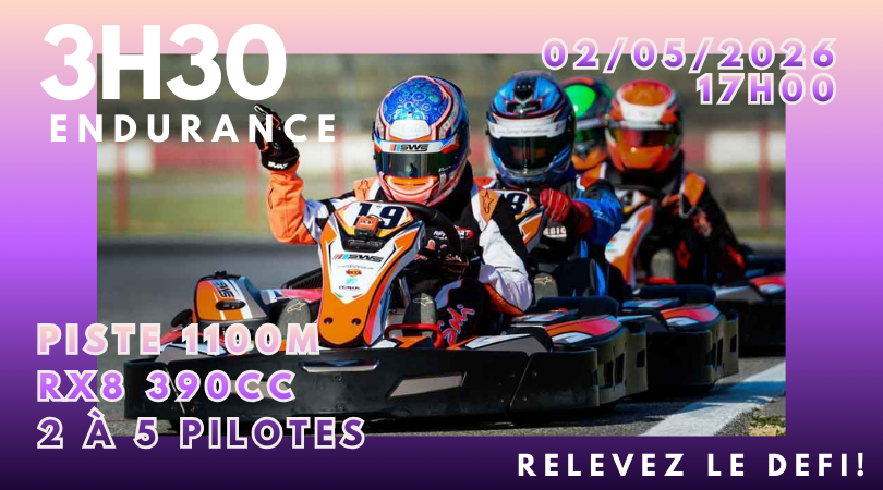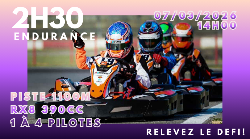 Inscription pour l'endurance du samedi 7 février 2026 RDV 13H45 : 2h30 sur nos karts RX8 270cc 9CV / Piste compétition - 200€/Equipage - Possibilité de faire la course seul!